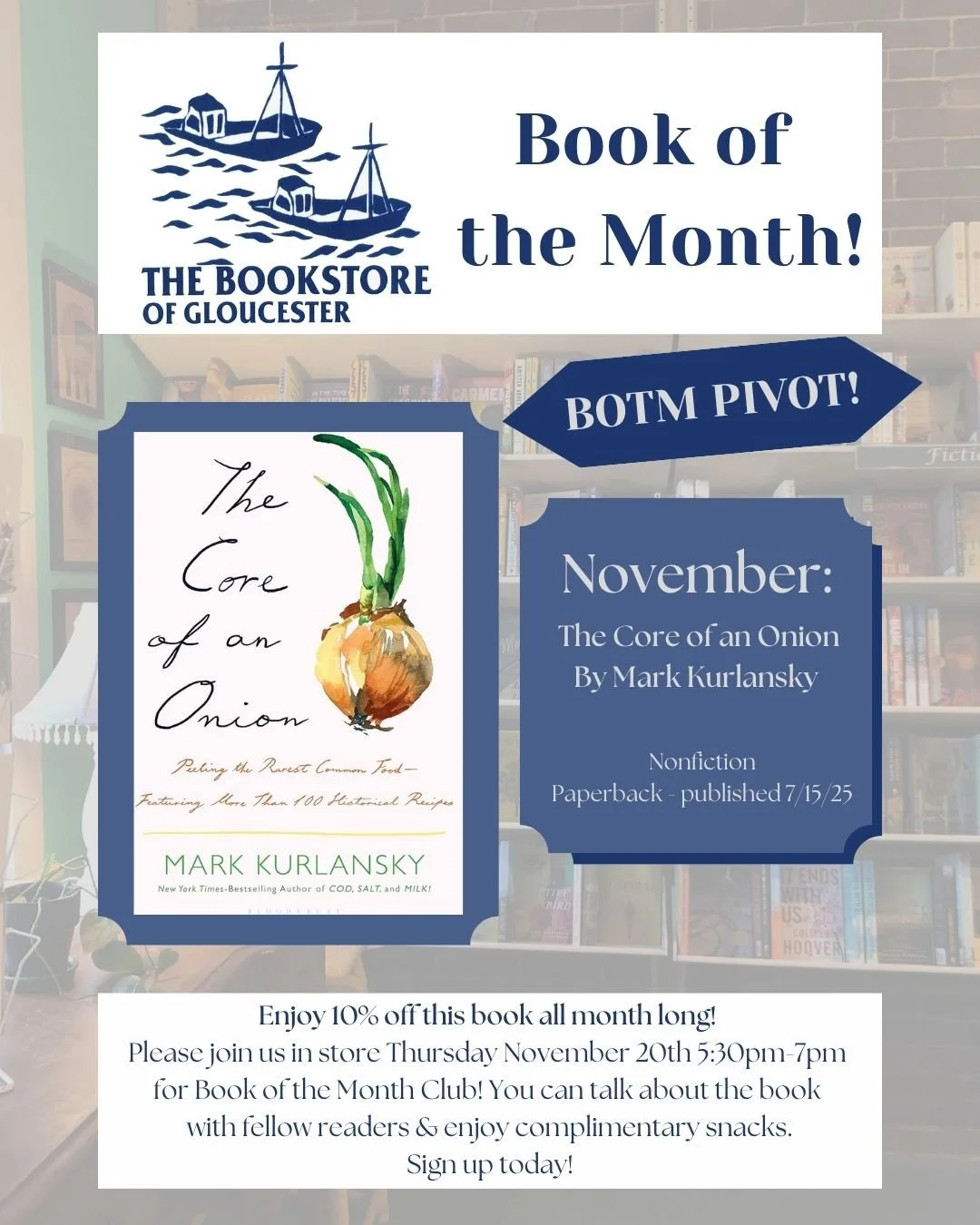 The last Thursday of each month, we will open the store for folks to come and talk about the book while enjoying some complimentary snacks & warm drinks.